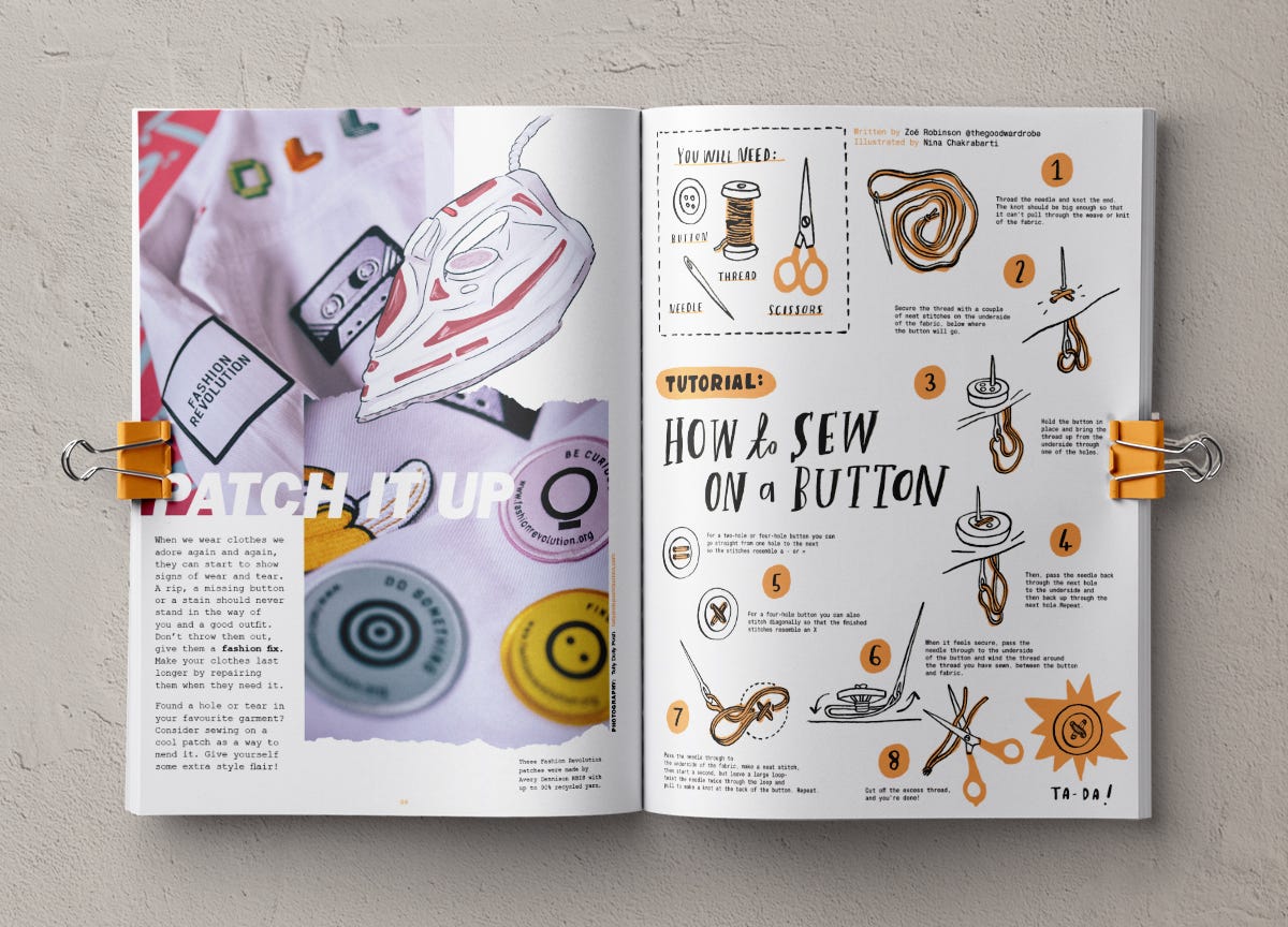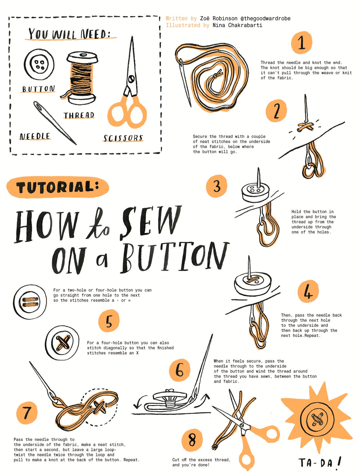 When it comes to a simple project like sewing on a button there are a surprising number of different ways it can be done, though some will work better than others. A few years ago I was asked to create a ‘how to sew on a button’ guide for Fashion Revolution’s Zine. This is how I usually sew on a button. There are other methods available!