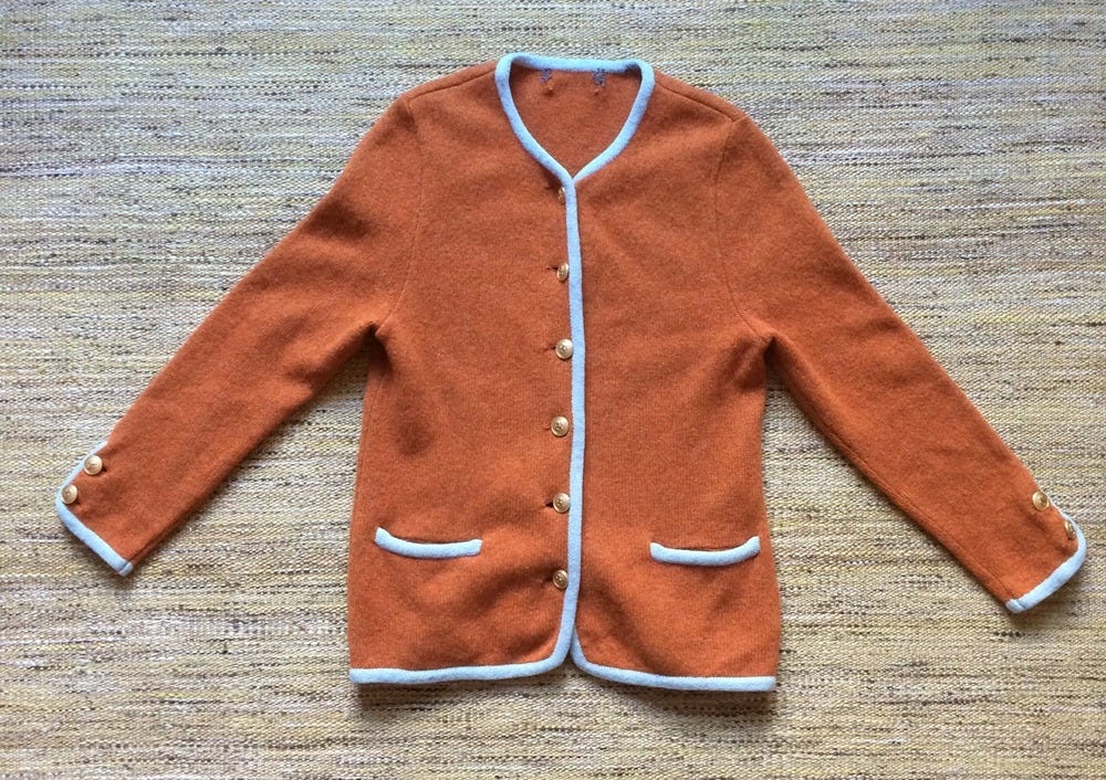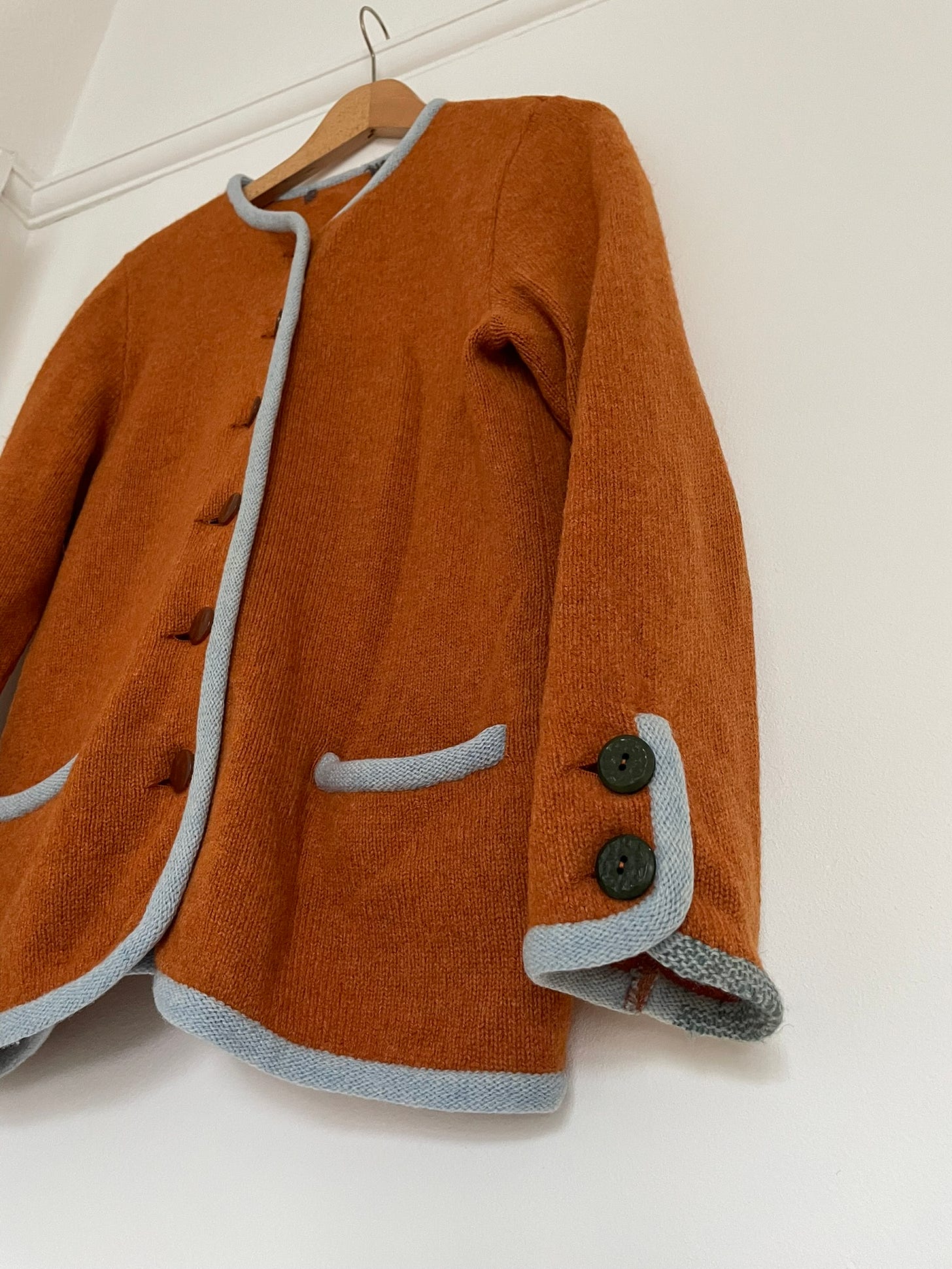 When I bought my orange wool knit in a local charity shop it had garish gold buttons that wouldn’t have looked out of place on Dynasty. The Austrian-made Shetland wool cardy is amazing quality but the buttons, well, they had to go (in case you haven’t read last week’s post, I bought it for a mere £8.99 but these knits cost in the region of £250 new).