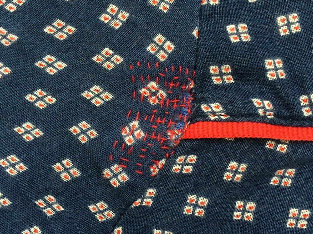With this exceedingly hot weather in mind, I thought I would instead share another of my sashiko-inspired repairs as it’s a great technique for lighter summer fabrics. This method of patching by hand sewing small stitches is also handy for areas where fabric has thinned or is strained around seams.