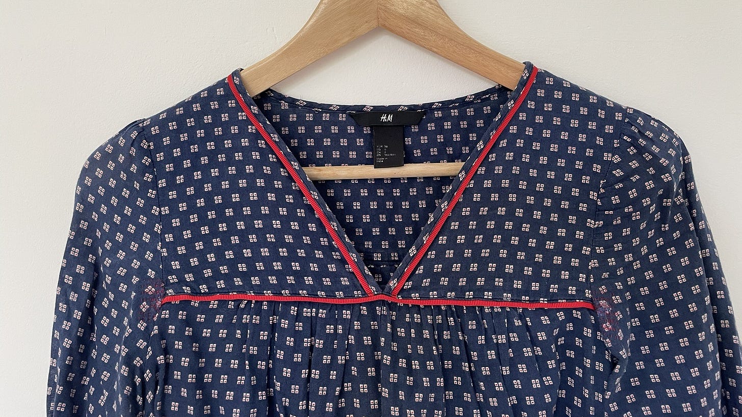 I often make my repairs neater than this but sometimes I’m happy with less tidy stitches. They work with the relaxed, loose vibe of the top, are hidden somewhat by the pattern and are quicker to do. It’s a visible mend that doesn’t jump out at you but blends in to the print.